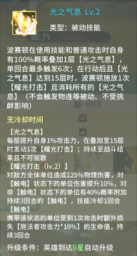 [光之气息]每积累一层,便能使自身攻击力提升1.6% 。当该效果成功叠加至15层时,会触发1次[耀光打击]。此效果会一直持续,直至战斗结束,并且无法被驱散。