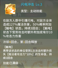 于敌方人群里引动闪电爆发,对敌方全体施以127%的魔法伤害,有50%的几率附加[触电]状态,此状态持续3回合;处于[触电]状态时,若遭受攻击,则额外附加皮埃尔10%攻击力的伤害