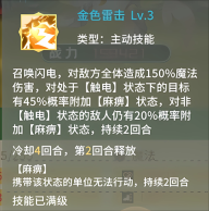 技能【金色雷击】有50%的几率给目标附上【封印】状态,处于封印状态的目标无法暴击。
