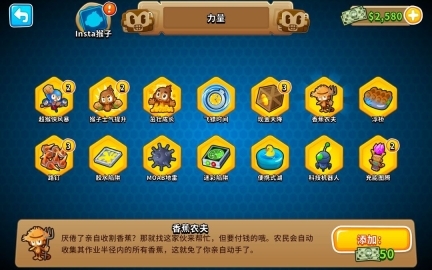 3. 挑选地图里已经放置好的猴子塔,消耗金币来购买对应的技能以获取技能效果。(每一个放置的猴子塔都是独立的单位,所购买的技能仅对选中的那只猴子塔生效)