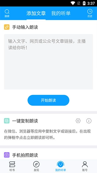 5、切换“添加文章”页面,可以添加复制文字,开启人声朗读