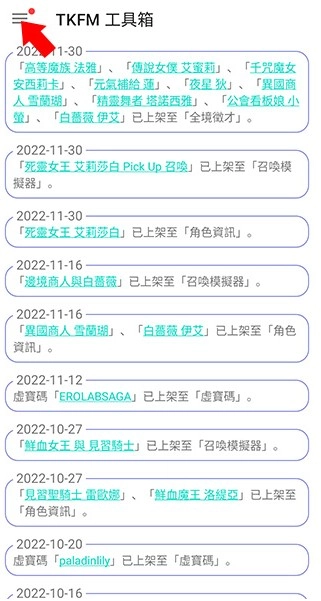 1. 首先下载tkfm工具箱官方最新版本,下载完成后打开该应用。进入首页后,找到并点击左上角带有三条横杠的按钮。