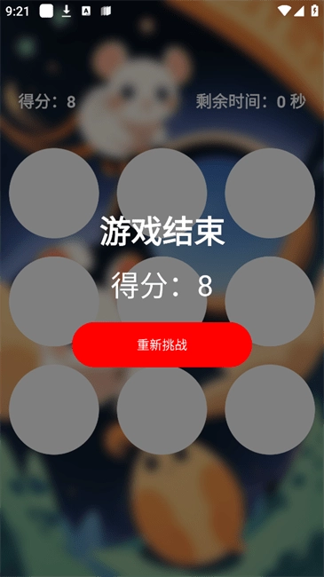 萌猫快消,这是一款有着经典打地鼠玩法的小游戏。在游戏里,卡牌会快速闪动,玩家需要击中从中出现的小老鼠,每打中一次就能加一分。时间一到,快来看看自己能拿到多少分吧!