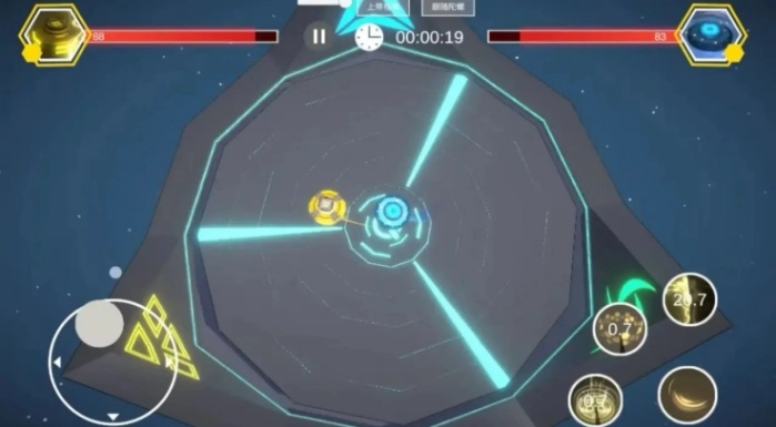 5、玩家能够借助左侧轮盘操控陀螺移动,右侧是技能键。