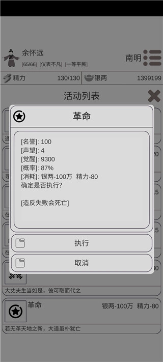 新手攻略:我看到有人说革命一直是0,就特意去试了一次。在60多岁时成功了,不过由于没留意大明的稳定度,结果不小心让它分裂成南明了,为此还多花了些时间。