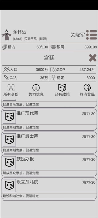 第一步是资金方面,一旦拥有100万,要立刻前往宫廷解锁与觉醒相关的政策,时间上越早行动越好。要是没有这类政策,那就转而研究艺术。