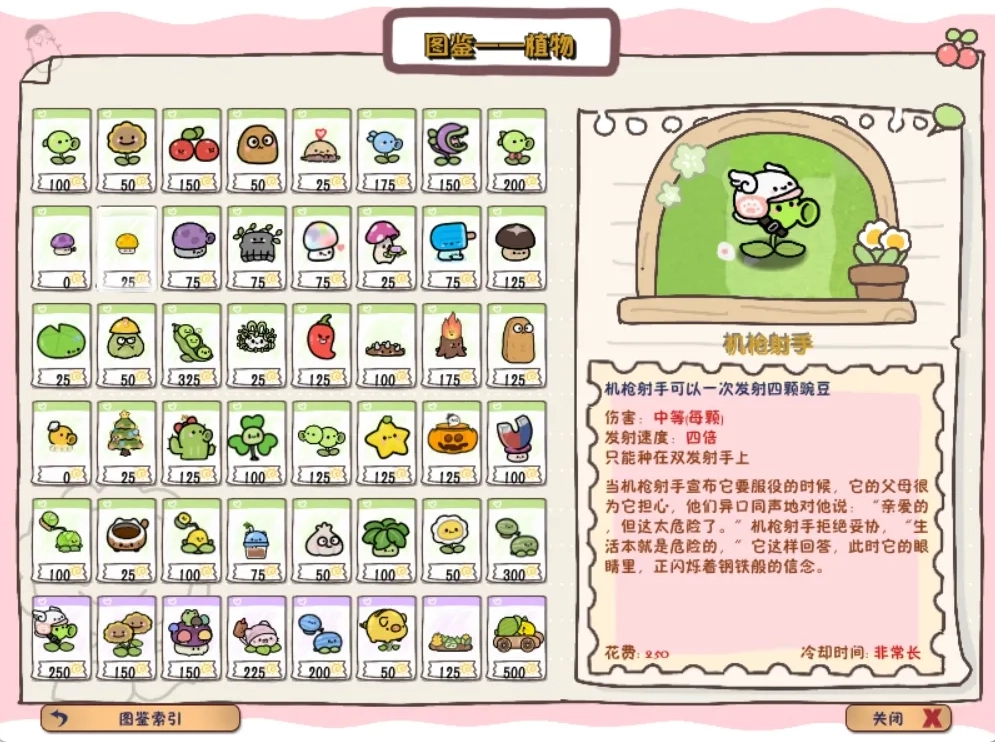 2、机枪射手,呆着一顶可爱头盔,一次可以发射四颗豌豆,需要种在双发射手上;