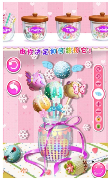 1、提供数十种配料装饰,玩家可随心搭配,只为打造最美味的棒棒糖蛋糕。同时,搭配简单易上手的游戏操作方式。
