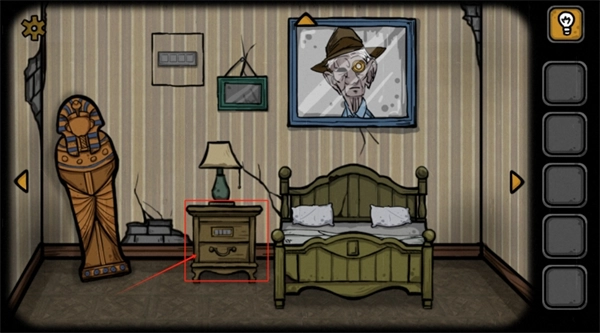 3、点床上的枕头调查,查看床头柜抽屉的锁孔寻找线索。