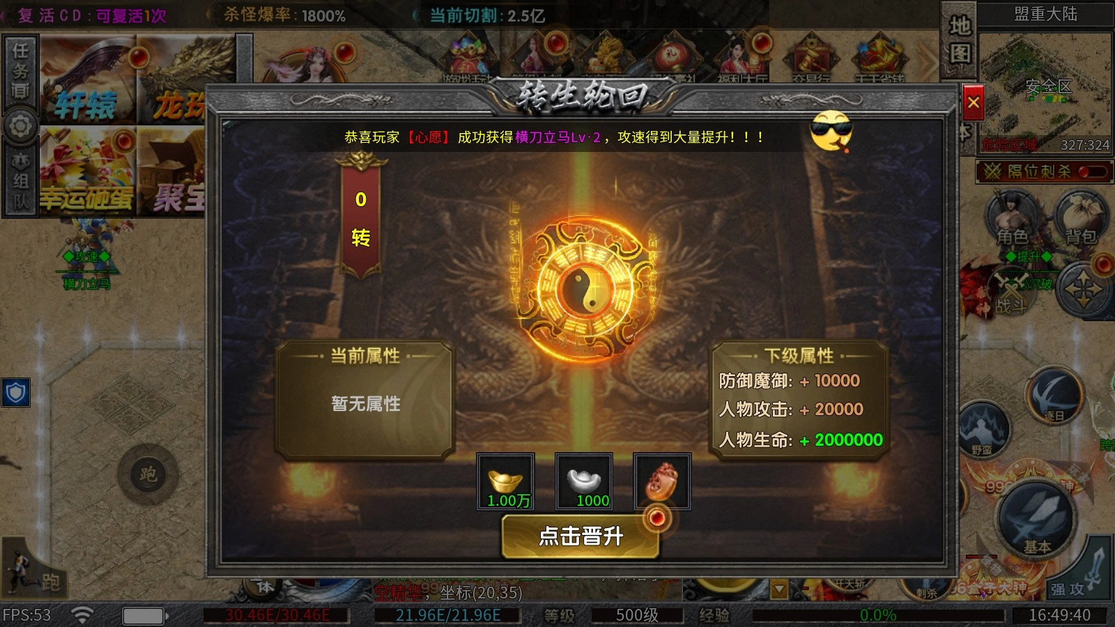 4、转生轮回:只需消耗元宝、白银与赤练石,就能实现晋升,同时还会给予大量的属性加成。