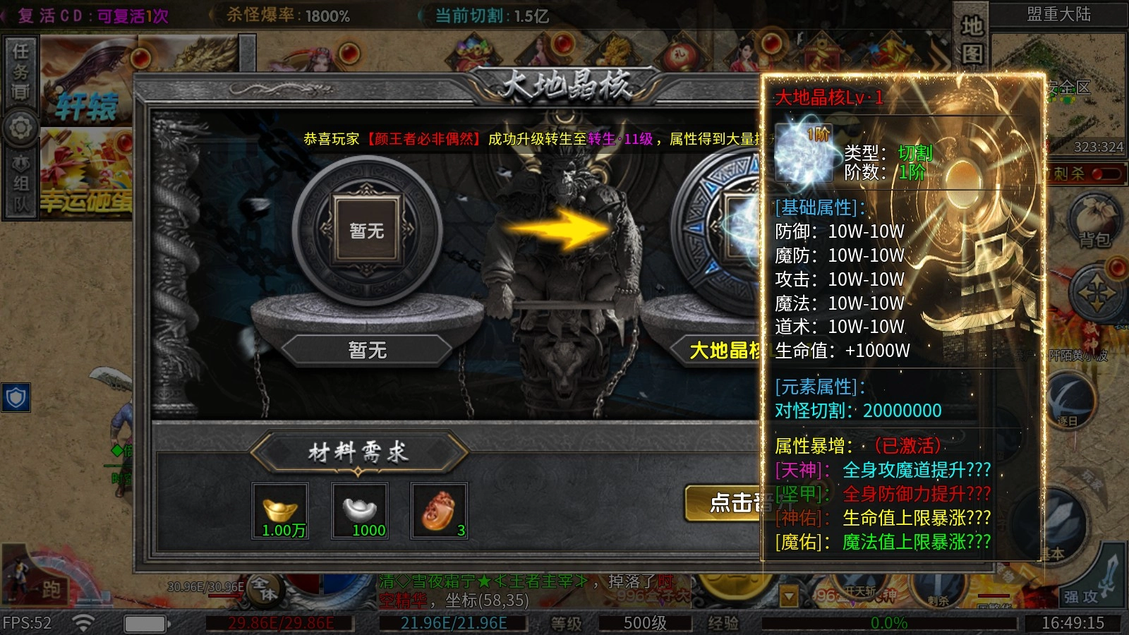 2. 大地晶核:通过消耗元宝、白银以及赤练石便能实现晋升,晋升后可显著提高对怪物的切割伤害。