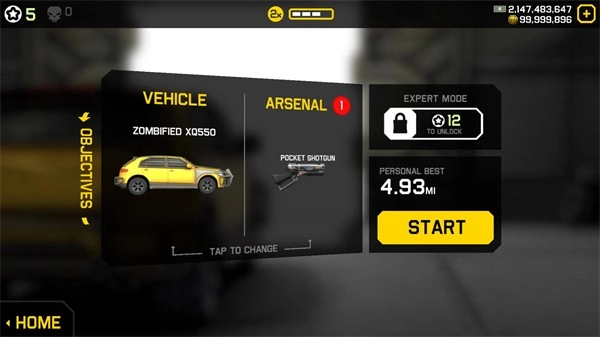 2、点击之后,能够挑选不同的车辆与武器来闯关,点击“start”即可正式开启。