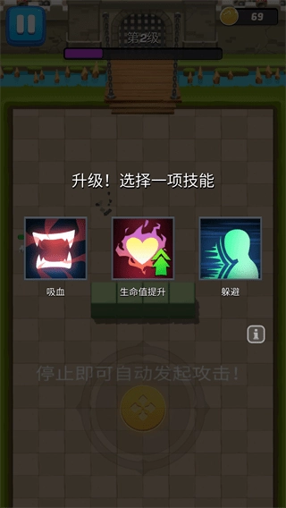 点击战斗即可开始游戏,在游戏中只需拖动下方的摇杆即可控制角色的移动方向,停止移动角色会自动发起进攻。