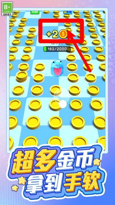1.屏幕中央弹出+2金币提示,高亮数值,棋盘格地面遍布金币,操控小果冻穿梭收集快速提升收益。