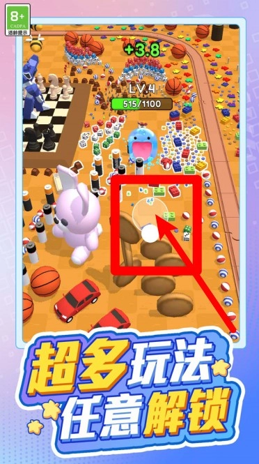 3. 果冻角色置身于满是道具和障碍的地图里,借助虚拟摇杆实现灵活的移动操控,在过程中收集物品,进而不断增大角色体型并提升等级。