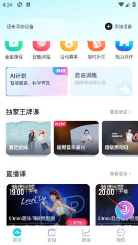 1、首页展示众多直播课程,由明星教练授课,内容涵盖骑行、跑步、划行、瑜伽等多种形式。