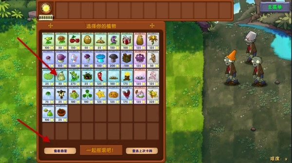 1、游戏开局还是和经典玩法一样,选择想要的植物进行闯关,在选择之前我们可以查看一下图鉴,这样方便了解一些融合的公式。