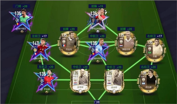 限定球员在双边位置上的出卡比较少,但是考虑到进攻边后卫比较多这一情况,可以选择让边后卫客串边前卫位置,能攻善守的埃尔南德斯与卡福的双边组合一攻一守,搭配自由人齐达内与影锋博格坎普,再用德布劳内居中串联,前方摆上策应轴心伊布,最大程度发挥两名进攻前腰的优势。