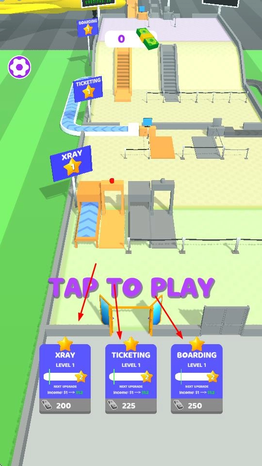 1. 对安检、值机、登机等设施进行升级,提高各设施的收益,积累金币资源,进而扩大机场规模。