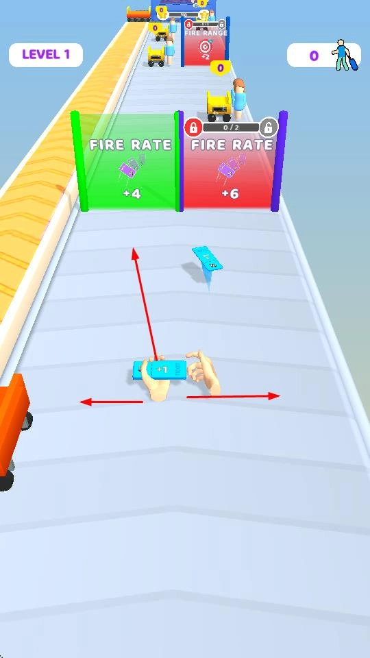 2、操控角色在跑道左右移动,选择增益门强化属性,需预判路径、快速决策,避开无效区域。