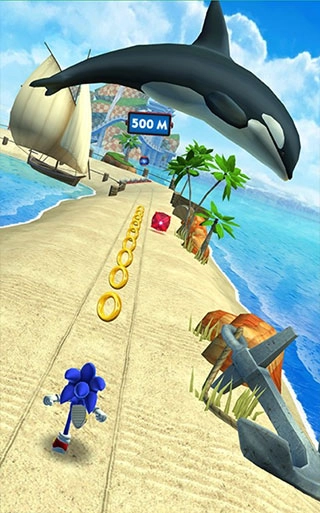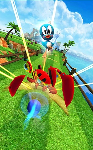《索尼克冲刺》融入了大量动作游戏元素。举例来说,玩家偶尔能在半空踩到“机械鱼”,凭借它的反弹力跨越沟渠。每当出现此类时机,游戏会用光圈瞄准“机械鱼”来给予提示。新手常常误以为必须精确点击“机械鱼”,可事实上,只要轻轻点击一下屏幕就能达成连跳。