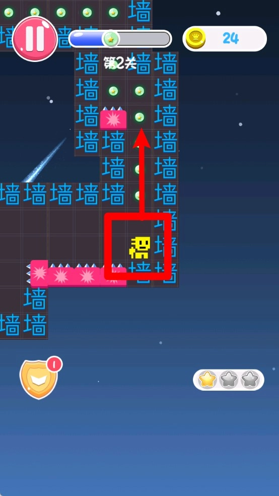 2.关卡操作提示:控制角色在墙阵中移动,避开尖刺障碍并收集星星,顺利完成挑战考验操作与反应能力。