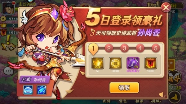 1. 5日登录即领豪礼,仅需3天就能领取史诗武将孙尚香。