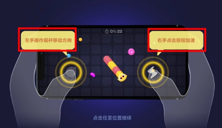 这款游戏采用经典的贪吃蛇玩法,玩家左手通过摇杆控制蛇的移动方向,右手则专门负责操控速度,点击操作可实现短暂加速。但要注意,加速会使自身长度缩短,因此务必合理使用该功能。