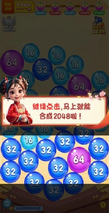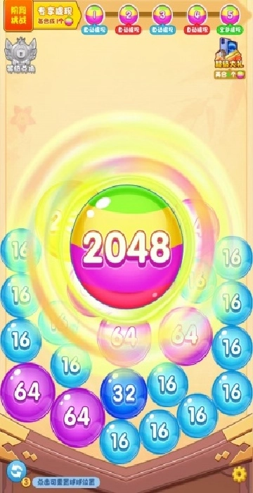 1玩家只需滑动屏幕,就能把数字相同的小球合并起来,让小球的数字一步步提升(比如从2提升至4,接着到8,依此规律直到2048 ),最后合成终极财神红包。