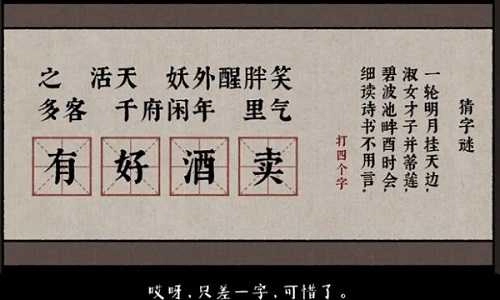5、前往【春风楼】,参与猜字谜【有好酒卖】。(需从左边句子里,把这4个字拖至下方方框。)