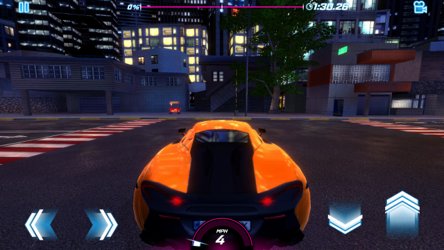 1. 轻点右侧的加速按键,让橙色赛车在霓虹闪烁的城市街道上发动,就此开启竞速之旅,凭借加速获取开局的优势。
