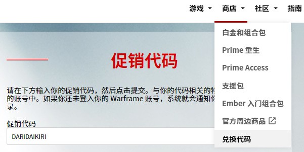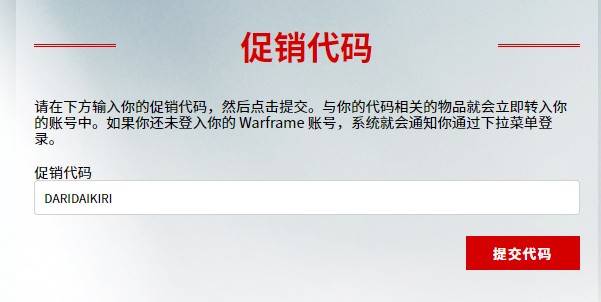 兑换码地址为:www.warframe.com/promocode?code=DARIDAIKIRI