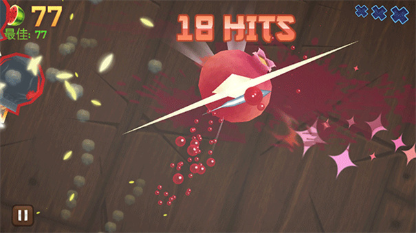 3、连削(Combo):当连续出现Combo时,不仅能获得分数奖励,水果出现与移动的速度也会加快,如此一来,在限定的60秒游戏时间里,就会有更多水果出现。