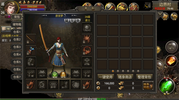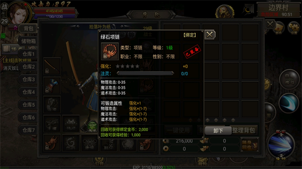 装备回收:随着等级提升,低级装备可回收换取大量经验。每次击杀怪物后,不管装备等级高低,都捡起来,攒满背包后到龙城装备回收员处回收。