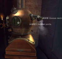 除了面板,潜水头盔设有三个窗口。由于水中本身能见度较低,在入水之前,必须清理窗口上的泥沙,否则泥沙会导致潜水员难以看清水中状况。潜水头盔左侧的鹅颈管连接着通信电缆,右侧的鹅颈管用于提供气体来源。在入水前,务必保证这两处鹅颈管拧紧且洁净!