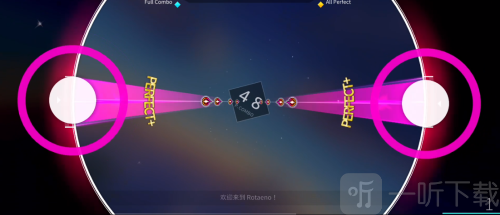 画面两侧的白色线条是CATCH音符的轨道,轨道上方会出现CATCH音符。判定圈的两边为CATCH捕捉区,在CATCH音符出现之前,CATCH捕捉区会发光予以提示。玩家只需旋转手机,使CATCH音符顺利进入左右两边的捕捉区内即可,无需点击画面,调整好角度就行。