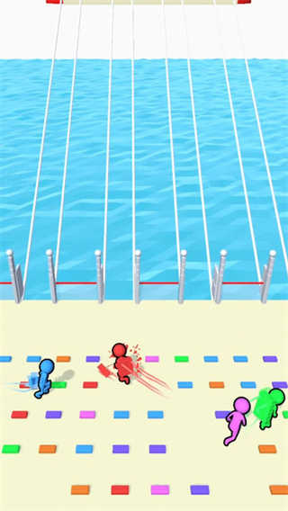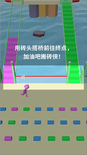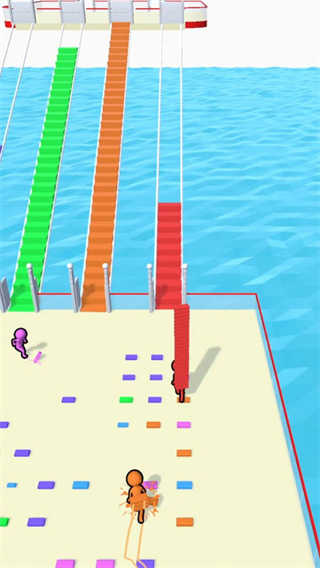 2、收集砖块搭建桥梁,借此抵达下一个平台。在此过程中,务必防止他人攻占你搭建的桥梁。你既可以选择一次性收集充足的砖块,把桥打造好,率先抵达终点者就能赢得胜利。