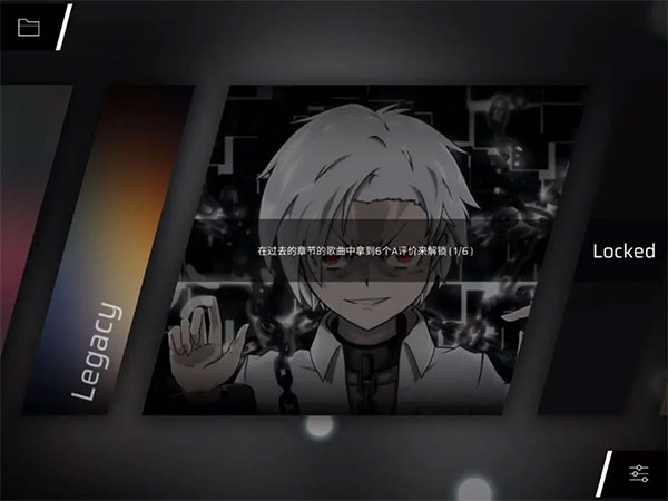 刚进入游戏,映入眼帘的是一大堆“Locked”,与之对应的章节在下图中以黄字标注。支线二的右侧还有一个支线三章节。建议一开始从左边数第二个的Legacy章节开始依次往后游玩,按顺序解锁,最左边的单曲精选集可当作买歌商店。(目前Legacy章节包含第一至第四章)