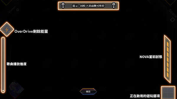 4、画面左侧展示的是歌曲的播放速度以及OverDrive剩余能量,右侧呈现的是NOVA当前状态。