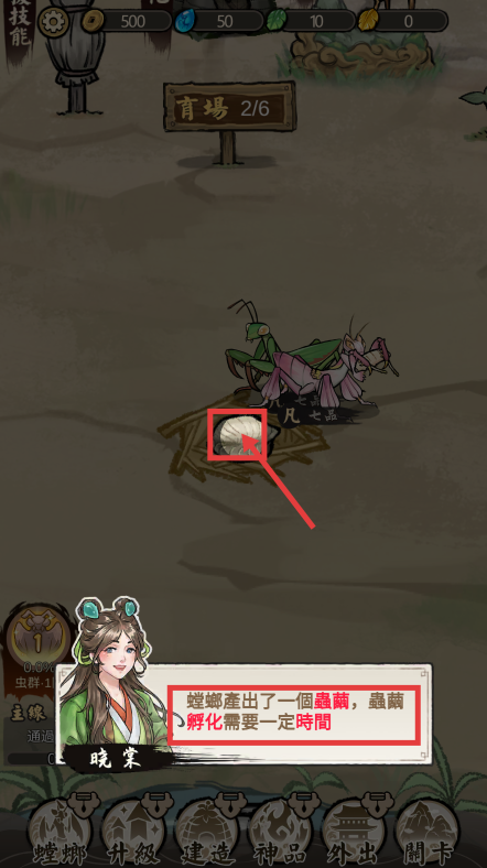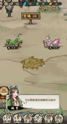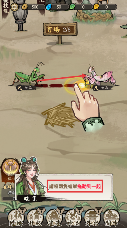 2、在育场场景里,依照提示把两只螳螂拖拽到一块儿,借此触发与繁殖相关的养成操作。