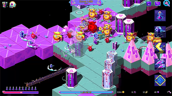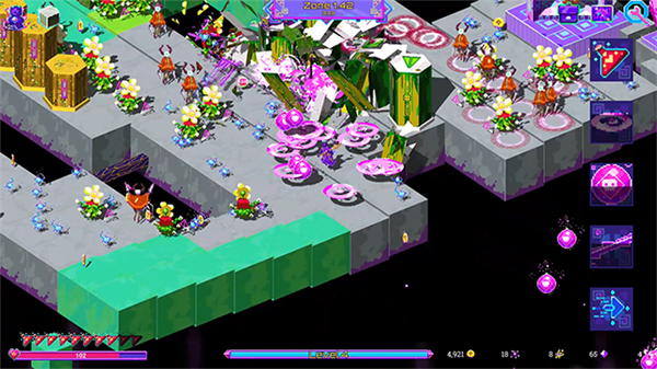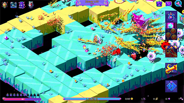游戏巧妙融合霓虹炫彩与像素复古风格,法术释放及地图元素所呈现的霓虹光效,视觉冲击力十足。