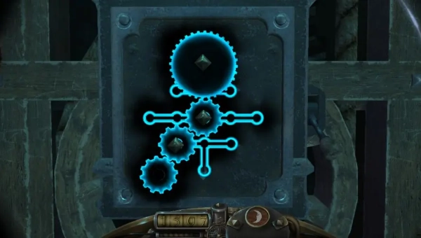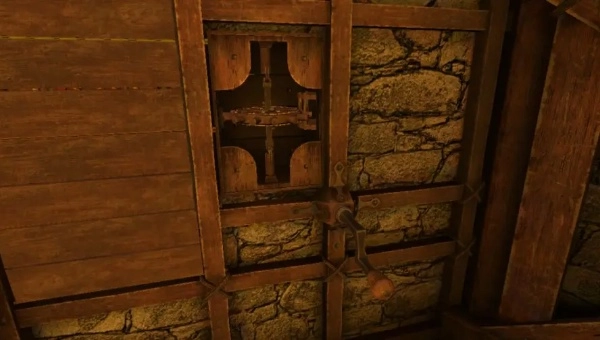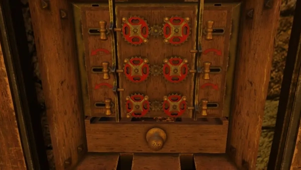 6、开启永恒之眼,把齿轮位置调整好后进行拖拽,接着拉动右侧的拉杆,随后前往二楼。依据右侧木柜的锁孔来调整钥匙,之后拉动两侧的把手,这时楼梯就会降下。