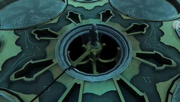 5、回溯往昔,转动第三层的圆台支架,获取金属圆环。把金属圆环插入第二层木架的底部,拉动圆环,接着移动滑块,拽动第二层木架左侧的支架,进而打开木门。