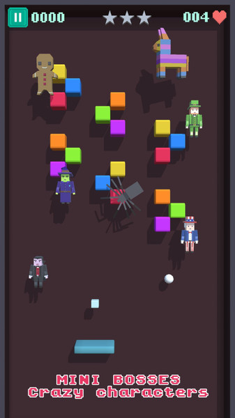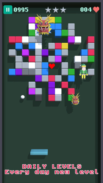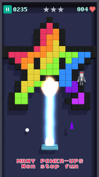2、破坏砖块:每种彩色砖块拥有不同耐久值,精准反弹打破所有砖块即可过关;