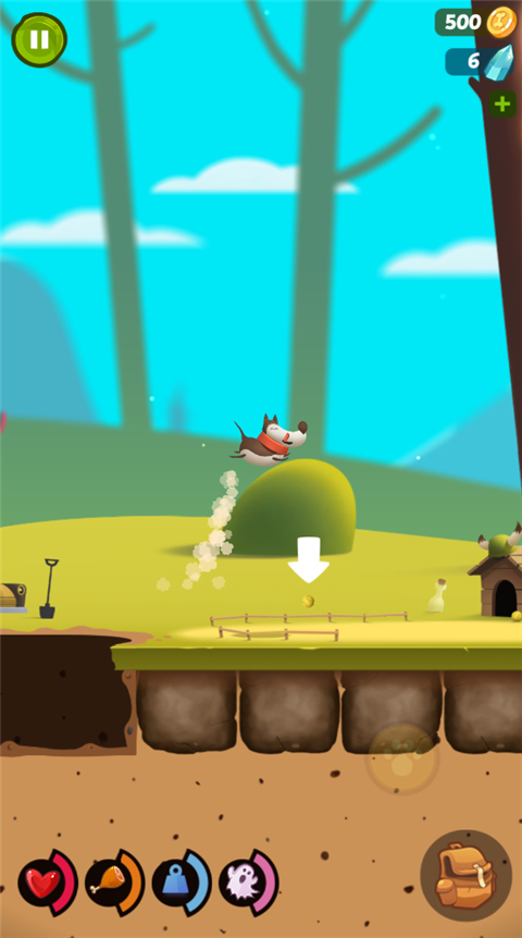 1、首先我们在游戏开始之前玩家要熟悉游戏的操作,左下角有四个箭头,玩家按不同的箭头会让小狗往不同的方向前进。右下角是让小狗进行翻滚和跳跃的按钮。有时候过关还靠各个操作的衔接。