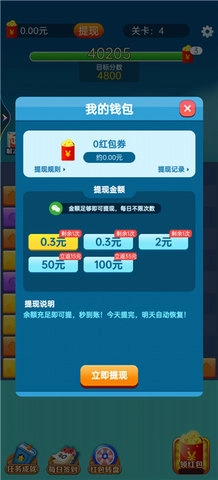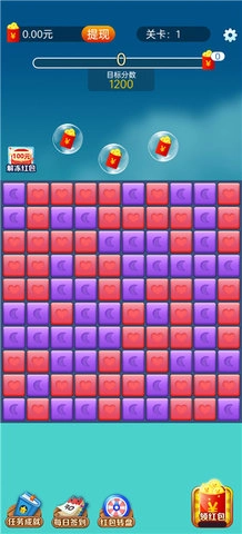 玩家只需点击相同颜色的方块就能消除它们,消除的方块数量越多,得到的红包奖励就越丰厚。游戏里有大量关卡,通关后会自动解锁下一关,玩家可以持续挑战更高难度的关卡。此外,玩家还能领取各类任务,完成任务可获得不同成就和游戏奖励,从而提升游戏体验与收益。