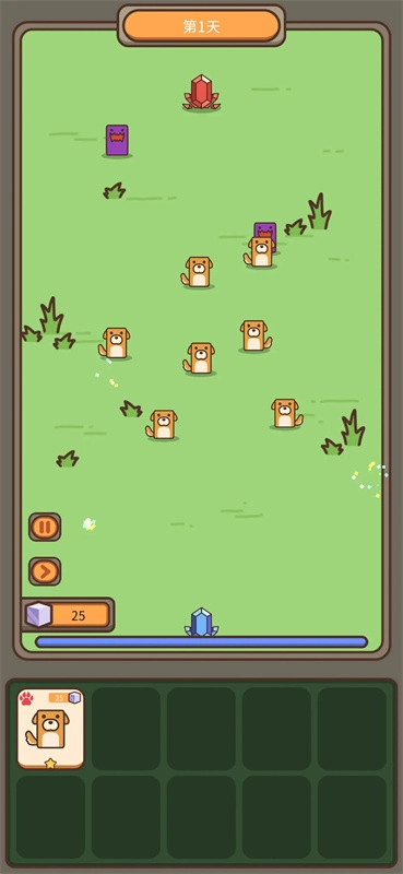 3:进入战斗界面(例如第1天的战斗场景),动物会自动和紫色怪物这类敌人展开战斗,此时需要留意战斗的进展情况,保证动物能够顺利战胜敌人。