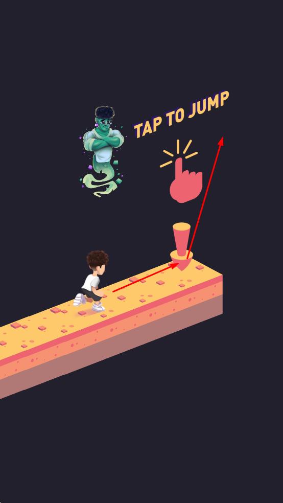 1、当看到TAPTOJUMP的提示时,点击屏幕就能让角色完成跳跃动作,以此跨越路径上的各种障碍,正式开启跑酷进程。