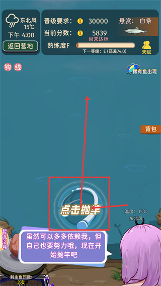 2、按提示点击【点击抛竿】,结合【当前分数-5839】与【晋级要求-30000】,合理使用剩余【鱼饵-2次】推进分数积累。
