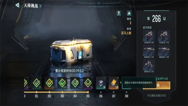 玩法介绍:天梯挑战分为考核挑战及挂机奖励两个部分。考核任务类似战斗爬塔,难度随着层数升高而增加。每次完成考核可以获得一次性奖励,奖励包括兵种模组、信用点、量子合金等。考核任务每天有100次成功层数上限,失败无影响可一直挑战,建议大家多尝试几次。